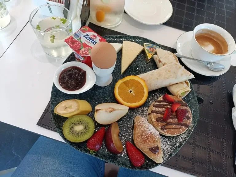 We wachten rustig af en dan komt meneer terug met 2 grote schalen, 1 zet hij bij Stijn neer, 1 bij Joyce, dan loopt hij weg en komt met schaal 3 terug, meld daarbij without toast en zet die voor de neus voor Le. We kijken elkaar eens aan, er zit werkelijk geen klap verschil tussen de schalen met ontbijt, maar in zijn optiek blijkbaar wel. Na ongeveer 5 minuten krijgt ook Merel haar ontbijt. We bekijken de borden eens goed. Het zijn wel plaatjes! Maar snappen doen we het niet, we hebben dingen aangekruist die liggen inderdaad op de schaal, we moesten wel even goed kijken waar de omelet was, die blijkt opgerold in een soort tortilla/pannekoek te zitten. Maar naast dat lekkers hebben we bijna alles gekregen wat ook nog op dat blaadje stond, maar niet is aangekruist. Nouja schiet ons maar lek, maar het oogt heerlijk en smaakt net zo dus wij zijn tevreden. Als we bijna klaar zijn met eten krijgen we allemaal nog een kannetje sap en zijn we echt meer dan verzadigd. We gaan naar beneden, verzamelen rustig de spullen, checken uit en stappen in de auto.