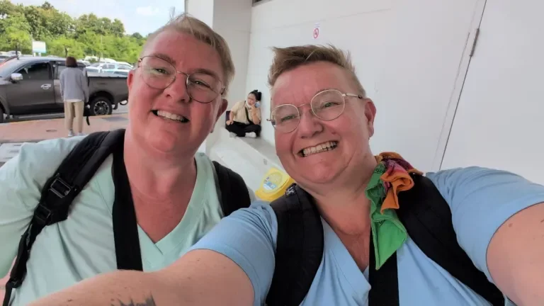 We vertrekken ruim op tijd en vliegen in 1 uur en 15 minuten naar Bangkok. We hebben respect voor de crew. In die korte tijd krijgen we een warme maaltijd geserveerd (heerlijk, rijst met pittige vis 😋😋😋) en drinken erbij. Hard werken voor die meiden hoor! Op Bangkok snappen we absoluut niet meer waarom we perse van stoel moesten wisselen. We wachten toch echt tot het hele vliegtuig leeg is voor we vertrekken met de bus, dus het maakte niets uit waar we zaten 🫠🫠 Binnen moeten we even goed kijken waar we nu precies naar toe moeten. Maar er blijken borden te zijn met “connecting flights to Chiang Mai” dus die volgen we maar. We hebben het gevoel de hele luchthaven te doorkruisen maar komen uiteindelijk bij de immigratie uit 🙏🙏 Hier wisselen Euros voor Thai Baht en melden ons bij de dame van Bangkok Airways die vlak voor de immigratie staat. Hier hebben we nog een sticker erbij gekregen op ons t-shirt. Ditmaal met de tekst ‘international bagage claim”