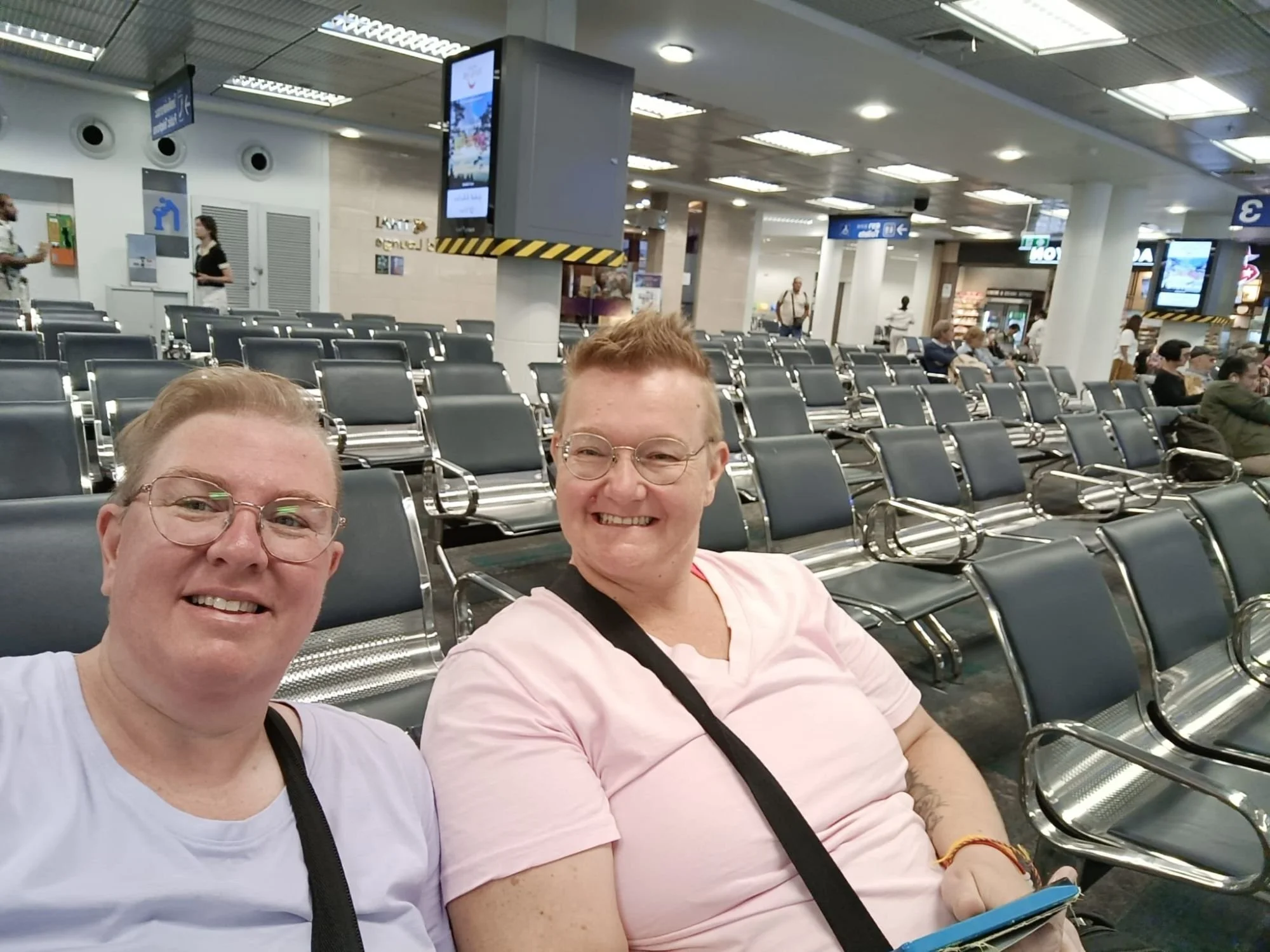 Op de luchthaven aangekomen is het ook hier weer rustig. Dus we kunnen bijna direct doorlopen naar de incheck balie en ja we waren al digitaal ingecheckt maar we moeten ons natuurlijk nog wel even melden en onze tassen laten voorzien van labels en stickers. Op deze luchthaven laten we onze tassen niet achter als de labels erop zitten, maar moeten we die zelf naar de check brengen 😉 Ook daar is niemand, dus we gooien onze tassen in het apparaat, wachten tot hij in het beeldscherm verschijnt en we door mogen. We mogen gebruik maken van de lounge, dus gaan we daar nog even een drankje doen. Maar we zijn er snel klaar mee, het is een beetje een mistroostige plek. We gaan door de douane en dan bij de gate wachten tot ons vliegtuig strak op tijd vertrekt.