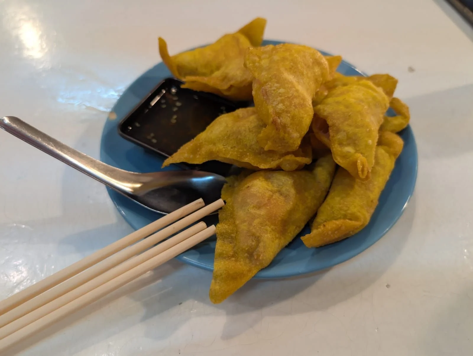 We blijven keurig staan onder ons afdakje en bekijken buienradar, maar die stemt ons niet erg hoopvol. Ondertussen giet het nog steeds. Na drie kwartier met veel regen, grote donderklappen en bliksem geven we op en bestellen een Grab. Aangezien er meer mensen zijn met dit idee moeten we even geduld hebben . Maar na een klein kwartier komt hij er aan en brengt ons naar het hotel. Daar aangekomen spettert het nog wat maar is de ergste regen overgetrokken. Wij lopen naar een straatje vlak achter het hotel en bestellen daar wontons. Heerlijk met een drankje erbij. Tijd om even rust te nemen in het hotel.