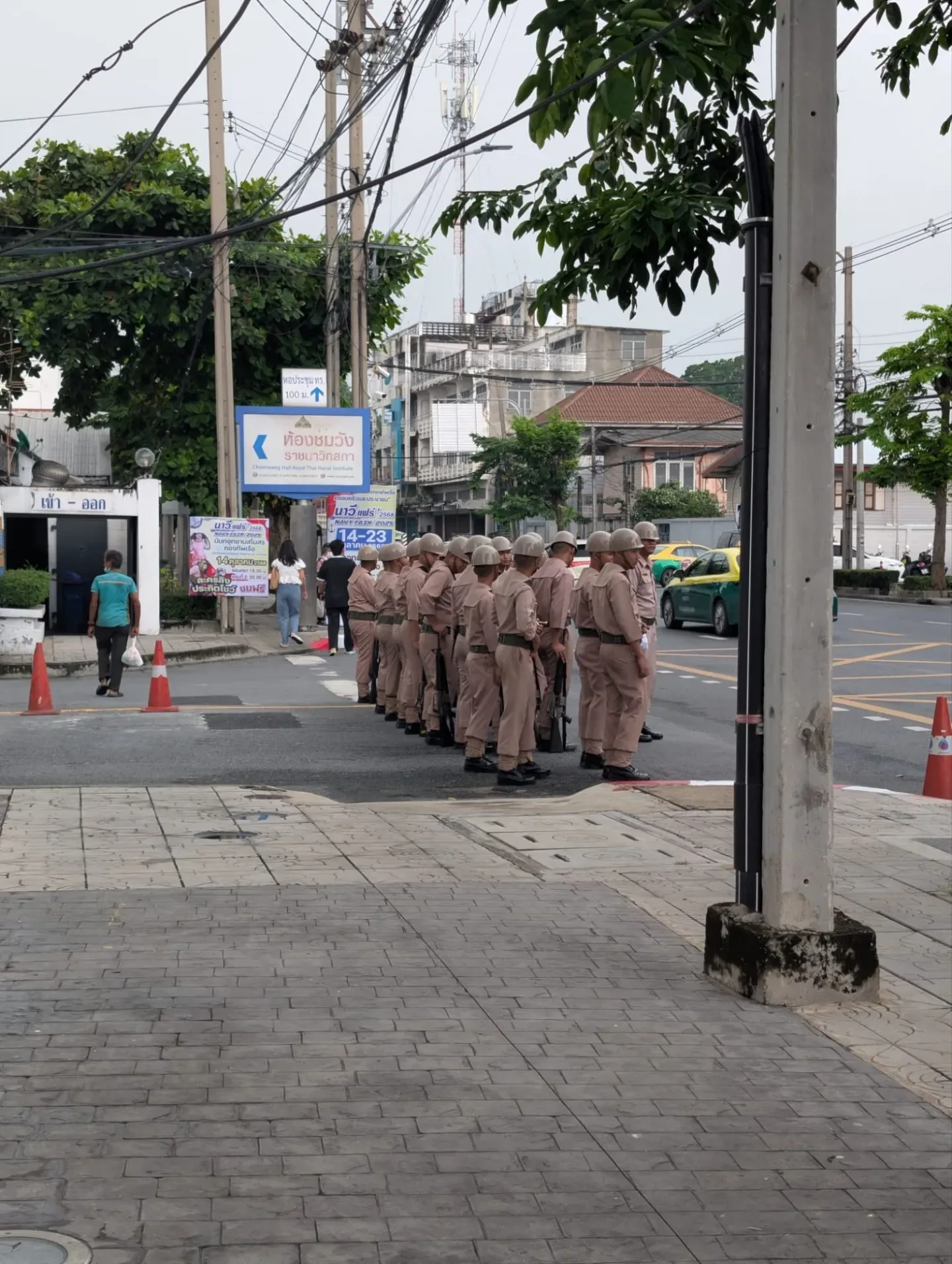 Onderweg valt het ons op dat de lucht richting de rivier zo langzaamaan zwart kleurt 😱😱 Maar het is nog altijd droog dus wij hopen de oma’s achter Wat Arun nog droog te bereiken voor het tweede deel van onze lunch, vanaf daar pakken we de boot dan terug naar de Satornpier wat in de buurt van ons hotel ligt. Zover zou het echter nooit komen 😭🤐 We lopen langs de marinebasis en zien een groepje van die jonge gasten met hun overste voor de ingang staan. Twee van die gasten hebben een hoorn bij zich dus yours truly Le bedenkt dat ze iets gaan doen, dus we stellen ons op om even te kijken. Eerst gewoon op straat maar als het begint te spetteren spotten we een afdakje bij de marinebasis zelf. En dan…. Ow die arme gasten de hemel breekt open, compleet met onweer en alles 😱😱 Maar de hoogwaardigheidsbekleder wordt keurig binnengehaald onder apel en het geluid van de hoorn, cool om te zien ☺️ De gasten mogen doorweekt weer naar binnen en wij schuilen maar verder want het regent ondertussen nog harder 😱😱 Gelukkig vinden de marine mannen het helemaal prima dat wij als twee westerlingen hier droog pogen te blijven 😉