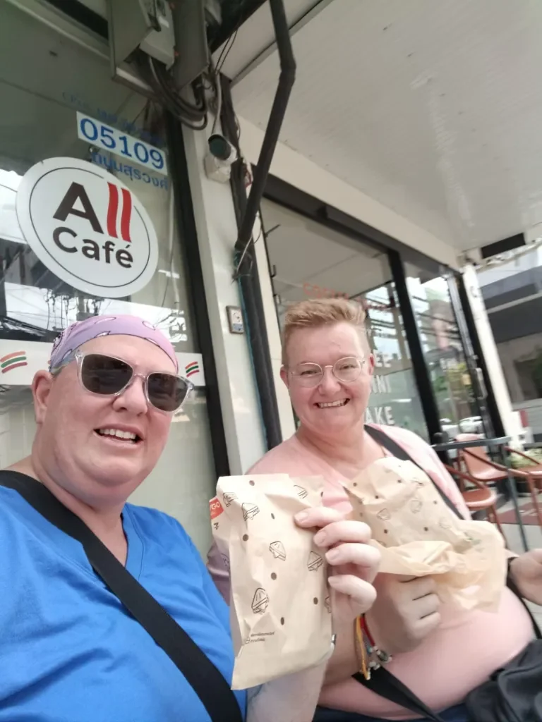 Als we ons eten op hebben en geblust zijn door de cola wandelen we het laatste kwartiertje naar ons hotel. Het is tijd om weer af te koelen 🥵😉 Maar eerst nog even een stopje bij de 7-eleven, Lekker wat te drinken en voor een keer weer het ultieme 7-eleven voer; Een tosti! Lekker chemisch 😂😂 Nadat we die hebben gegeten lopen we naar het hotel en worden we weer totaal over de top begroet door de parkeerwacht. Iedere keer als hij ons ziet salueert hij. Toch een beetje ongemakkelijk, maar we groeten hem iedere keer terug met een sawadeeka en gevouwen handen, de man is namelijk overduidelijk flink ouder dan wij 😉