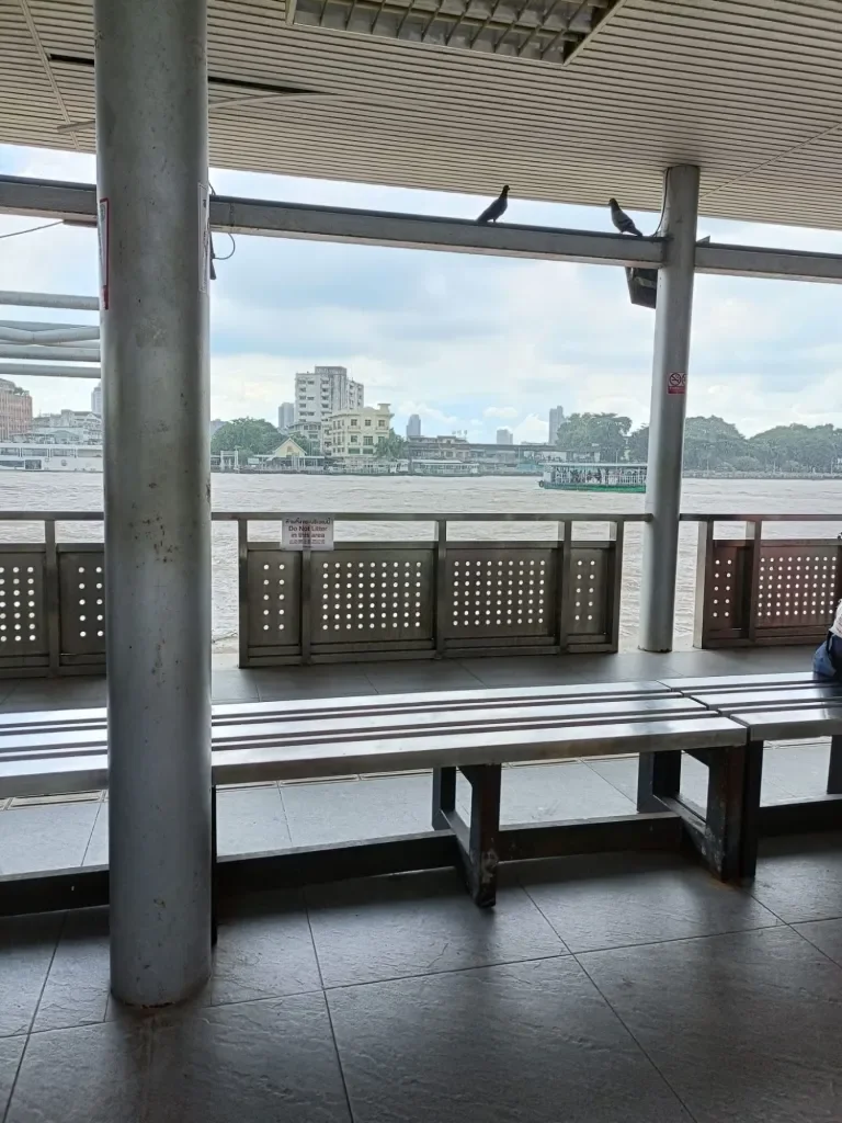 Hierna zijn we eigenlijk wel klaar met Chinatown en besluiten we naar de rivier te lopen en met de boot terug richting de Sathornpier te varen. We kopen twee kaartjes 30 baht per persoon (79 cent) en moeten een kwartiertje wachten. De kaartjes dame belooft ons te waarschuwen als de goede boot er is dus wij gaan chill zitten kijken naar het verkeer op de rivier. Toen we Chinatown verlieten zagen we alle verkopers zich klaar maken voor regen en inderdaad als we zitten te wachten klettert er een mooie tropische bui naar beneden. Maar als we uiteindelijk van de boot afstappen is het weer droog en wandelen wij naar onze bedachte lunchplek.