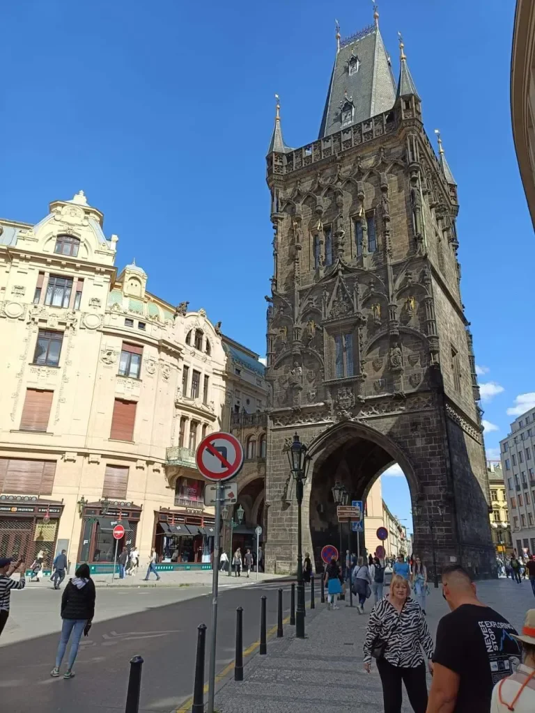 Hierna wandelen we de oude binnenstad in. We zien allerlei prachtige gebouwen en kijken onze ogen uit. We zien een gebouw met een prachtige schildering boven in en denken dat dit een museum is er worden in ieder geval tentoonstellingen aangekondigd. Google leert ons dat het een concertzaal is Obecni dūm, sjiek pand hoor! Concerten en de aankondigingen hiervan zien we trouwens door heel Praag. Je kunt je hart als klassiek liefhebber hier volledig ophalen. Als we om de bocht van dit prachtige pand lopen zien we een zwarte toren “the powder tower” oftewel 1 van de orginele toegangspoorten van de stad. Wat zijn die gotische gebouwen toch mooi!!