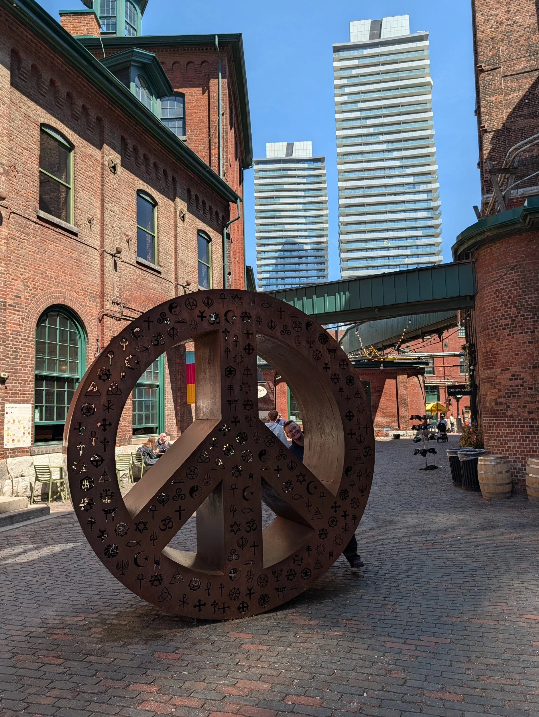 Het distillery district verwelkomt ons met een waanzinnig gaaf industriële omgeving, wat een toffe plek is dit! Oude fabriekspanden waar kleine winkeltjes in zitten. Overal terrassen en dit alles met robuste muren, donkere kleuren en bij vlagen erg bijzondere kunst. We besluiten na een rondje lopen op een terrasje neer te strijken in de zon. Het lijkt even een hele dure keuze te worden want de softdrinks staan niet op de kaart en de mocktails zijn een kleine 12 euro de stuk! Maar na een hoop geduld krijgen we 4 softdrinks voor een kleine 11 euro. Wat ons overigens wel stoort hier in Canada is het feit dat bij betalen je bijna verplicht wordt via een keuze scherm 18% tip te geven. Dat vinden wij wel ernstig veel als iemand 3 seconden aan onze tafel staat. Anyways als we uitgedronken zijn en de voetjes even rust hebben gehad wordt het toch echt tijd weer richting de auto te gaan. Het is even een druk reisje met een stukje lopen, de bus en twee metrolijnen midden in de spits, wat een mensen! Na nog even een supermarkt stop voor een broodje (wij moeders)/ wrap (Merel)/ salade (alle dames)/ warme maaltijd (Stijn)/ watermeloen en vocht wat we vanavond in het hotel eten. We willen er niet meer uit, de voeten zijn dood na bijna 12 km vandaag. Gelukkig hebben we morgen een reisdag en trekken we door naar Kingston!