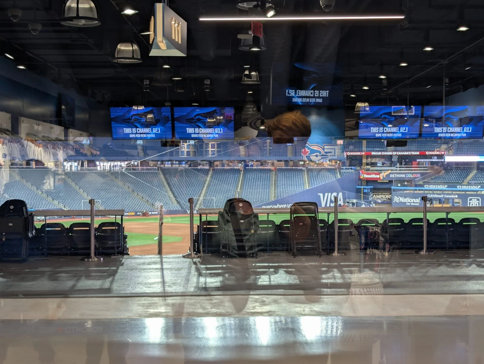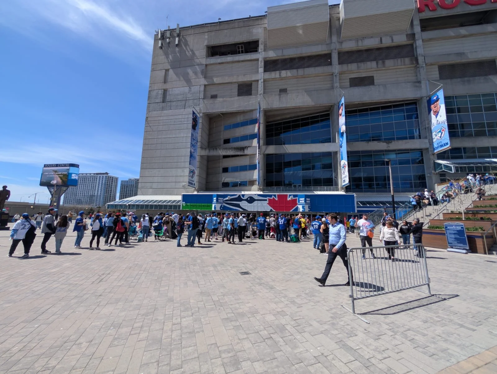 We kunnen naar het top dek wat op 447 meter ligt, schijnt het hoogste observatie dek te zijn van het westelijk halfrond! Tja als we er toch zijn… dan gaan we kijken ook! Dus hoppa met de volgende lift omhoog en voor we daar aankomen de uitleg krijgen dat er boven een kegelvormige pendel hangt waaraan je kan zien hoe erg de toren beweegt door de wind. Nou stond er niet heel veel wind vandaag maar yours truly Joyce had toch echt idee dat ze beweging kon voelen, kan natuurlijk ook de wens van de gedachte zijn haha. Na een rondje boven lopen we het laatste rondje in de ruimte onder het observatie dek. Hier is ook een soort optie gekanteld naar beneden te kijken. Wanneer yours truly Joyce en Merel dit doen blijkt dat je omlaag kijkt op een groot wit iets op hoogte waardoor de hele diepte wegvalt… beetje jammer! Hierna is het tijd voor de volgende activiteit, heel even de fanstore van de Toronto Blue Jays in, yours truly Joyce heeft haar zinnen gezet op het knalblauwe Jersey van dit team. Maar buiten dat de shirts 139 dollar kosten zitten ze ook nog eens niet mooi, baal baal baal!!! Shirtjes laten hangen even een korte blik op het honkbalveld van het Rogers Center en het is tijd weer te gaan.