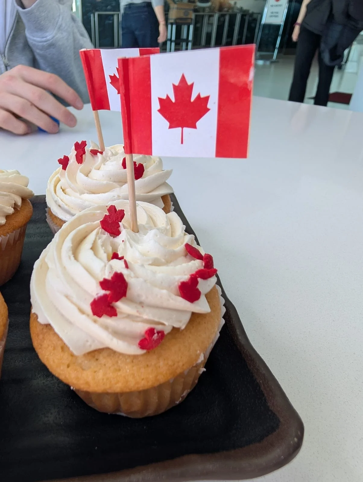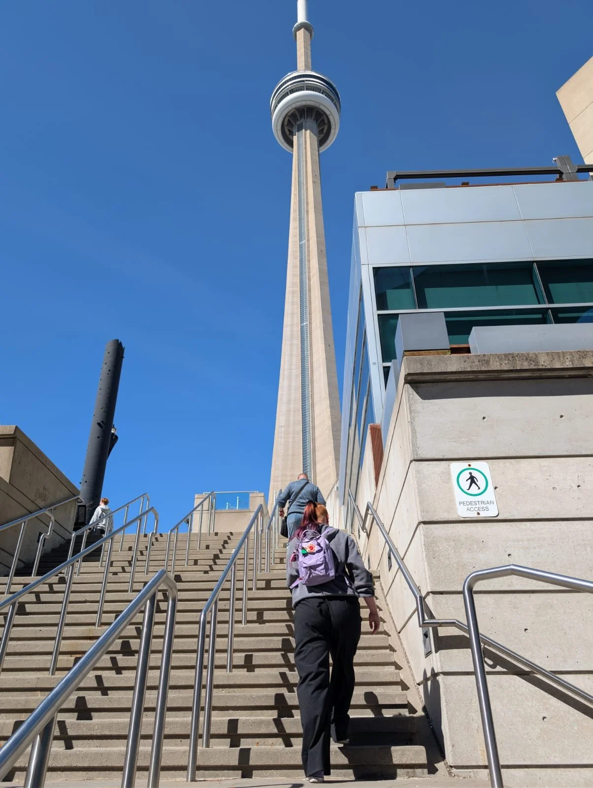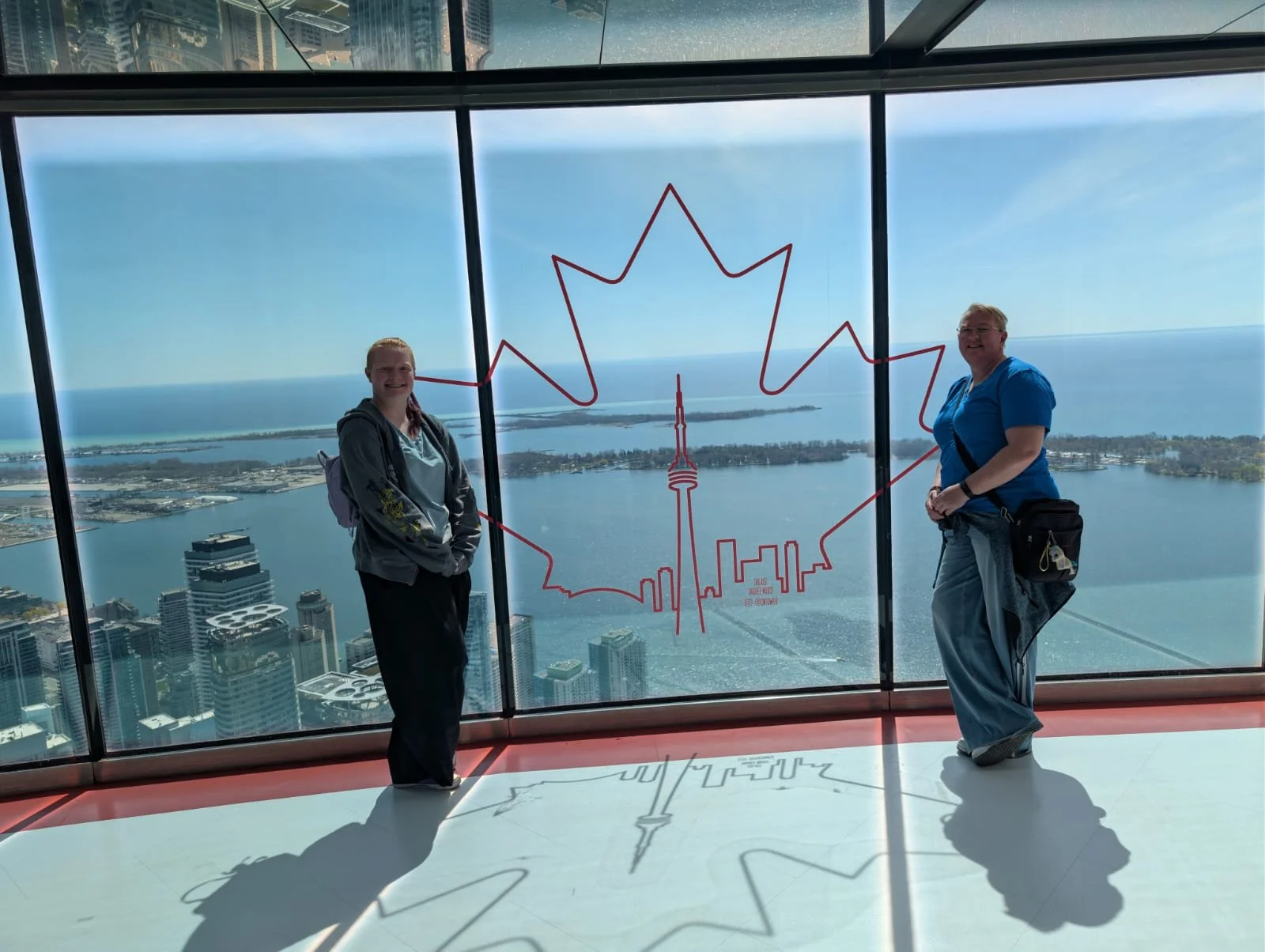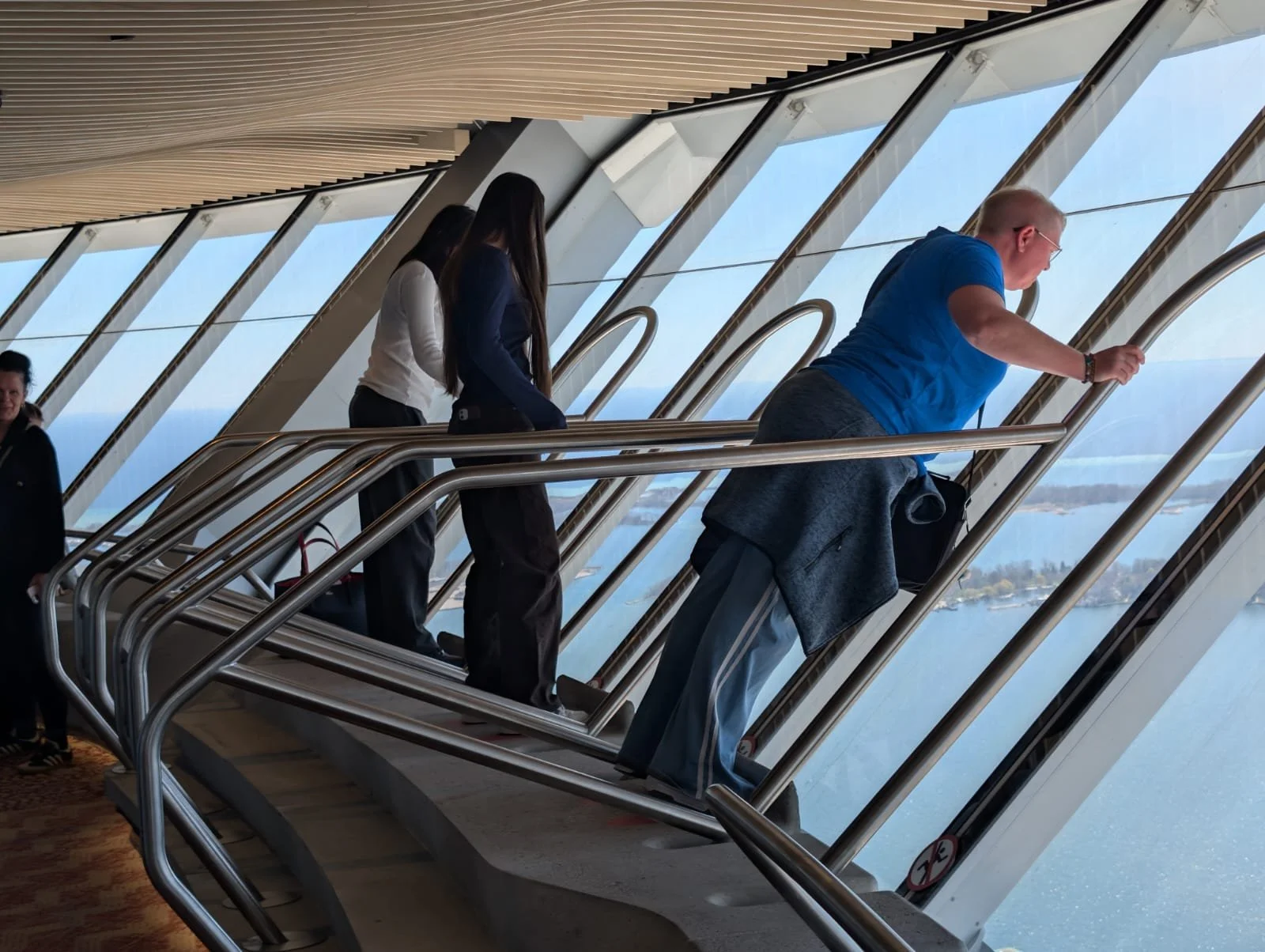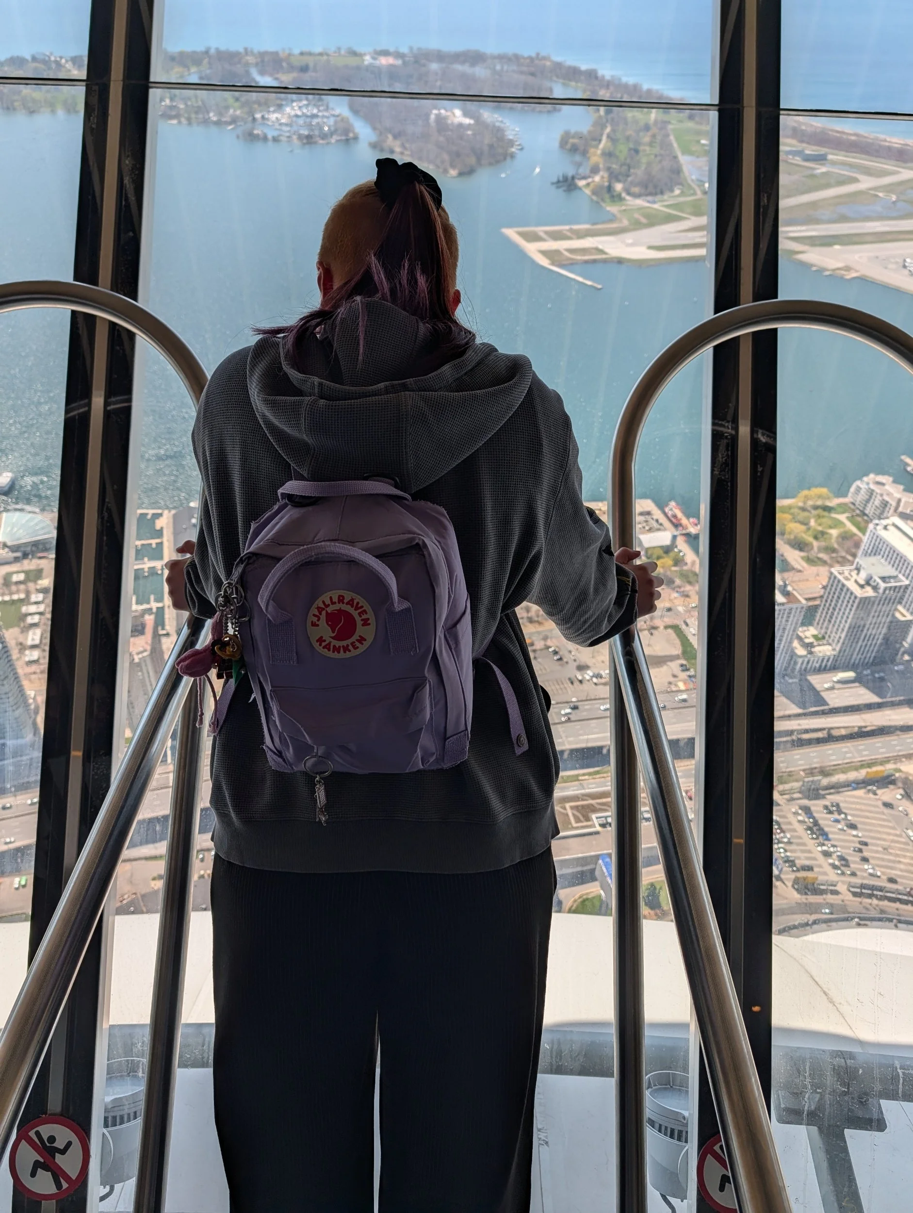 Boven aangekomen kijken we natuurlijk eerst uit de ramen, maar direct daarna besluiten we eerst iets te drinken bij dit mooie uitzicht. Yours truly Lé gaat aan een tafeltje zitten zodat we een mooi plekje hebben en yours truly Joyce gaat wat te drinken scoren. Iedereen een flesje drinken en als bonus de meest schattige cupcakes ever! Met een Canadees vlaggetje en sprinkles in Maple Leaf vorm. Als extra smaken ze ook nog eens goed. Top. Hierna lopen we het rondje af en genieten van uitzicht zowel over de stad als over Lake Ontario. Aan het eind van het rondje blijken we nog verder naar boven te kunnen.
