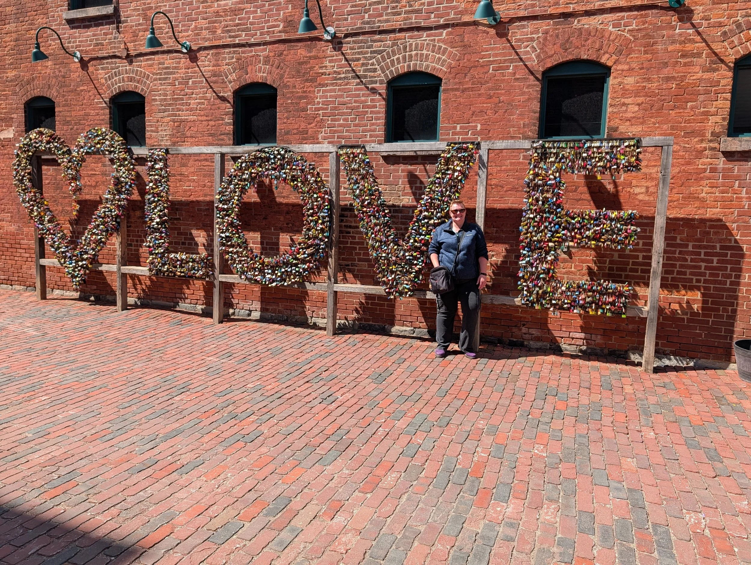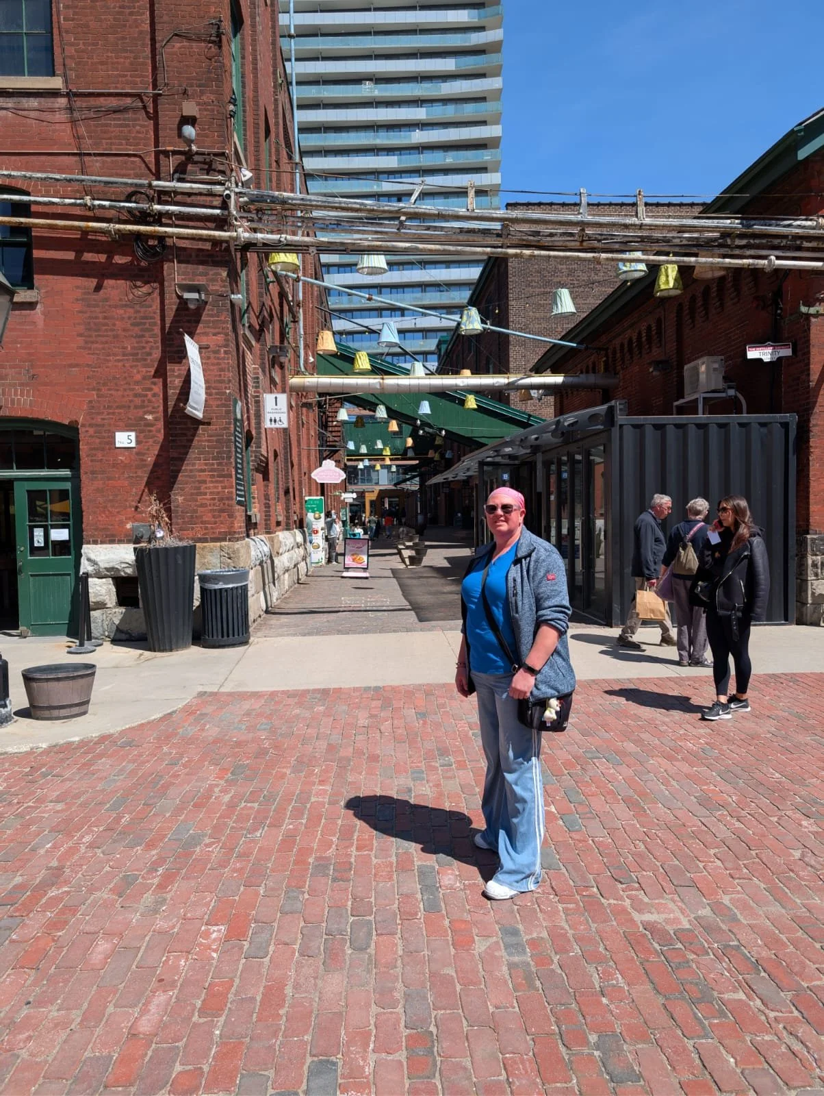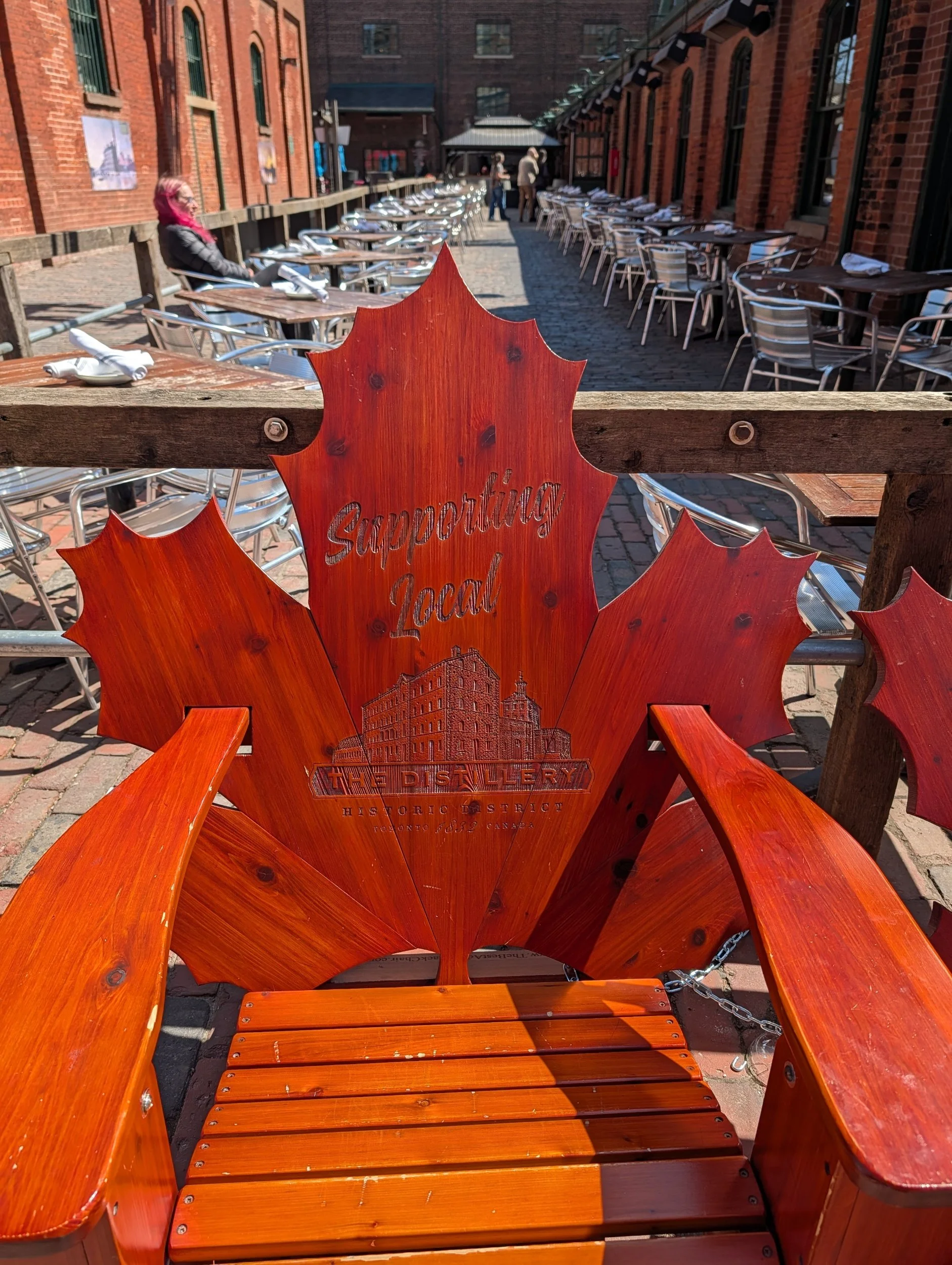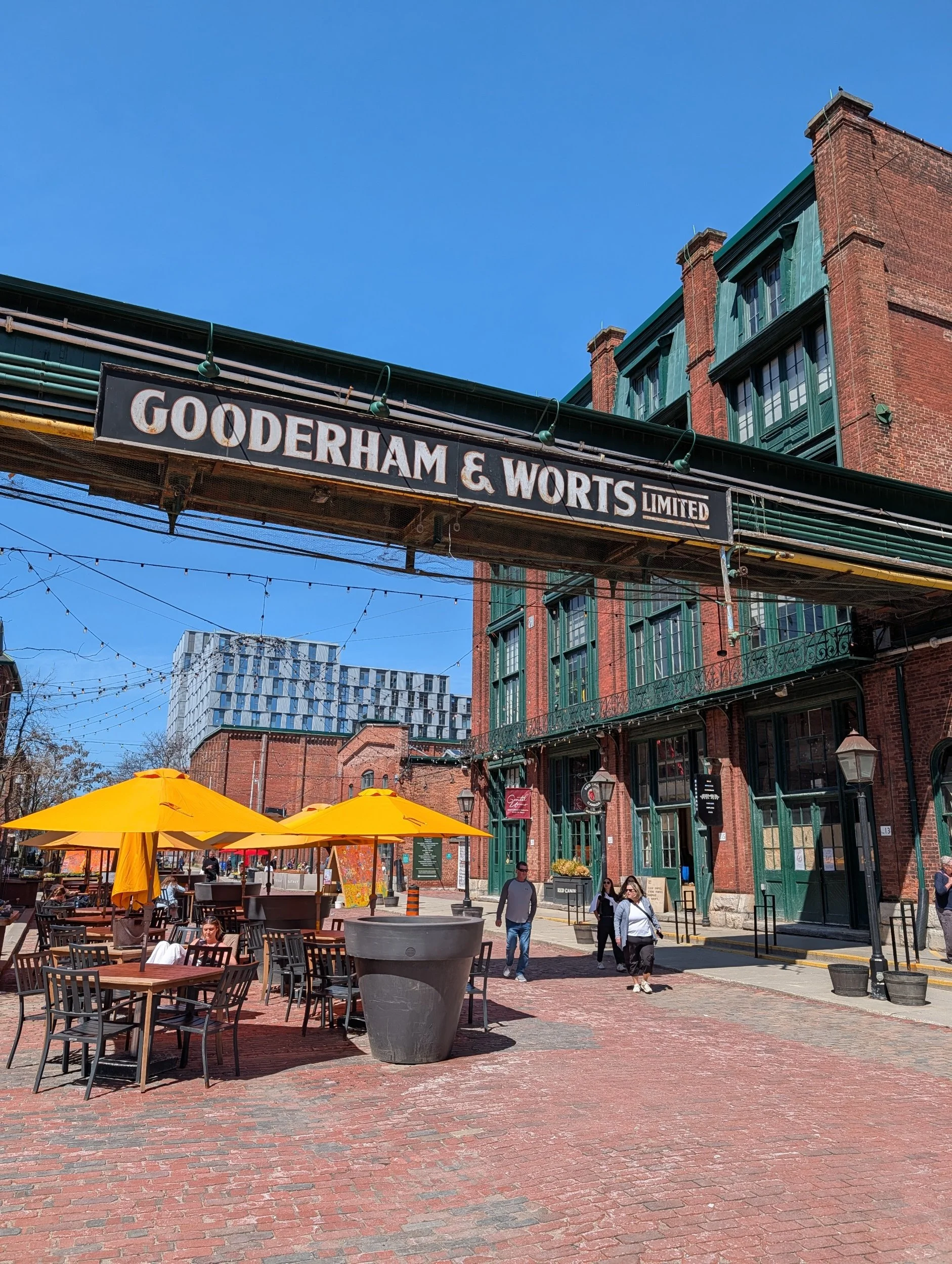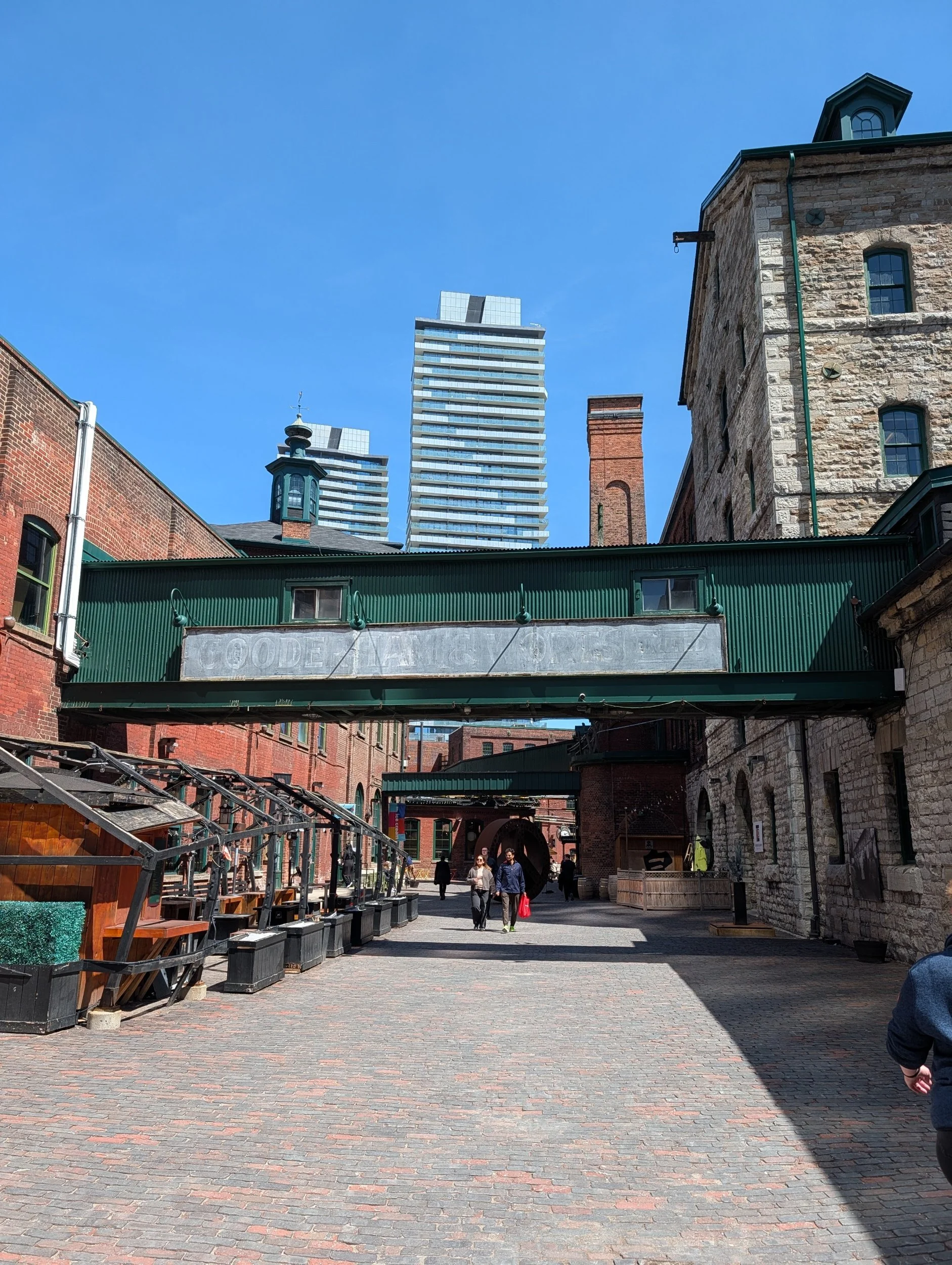 Eenmaal binnen bij Union Station is het even flink zoeken naar de Shake Shack. Na even vragen bij de informatie van het station blijkt dat we onder de stationshal moeten zijn. Wanneer we met de roltrap afdalen vallen we bijna om van verbazing, over de hele oppervlakte van dit grote station zitten er tientallen restaurants, bars en andere eetgelegenheden, wat gaaf! We moeten een behoorlijk eindje lopen maar dan kunnen bij de ‘order bar’ digitaal onze burgers, kreukel frietes, milkshakes en ijsthee bestellen. Naam invullen bij bestellen en al snel prijkt het proces op de schermen in het restaurant. Ook hebben we een nogal fanatieke buzzer op tafel liggen welke al snel als een bezetene begint te bibberen. We kunnen niet anders dan concluderen dat het goede burgers zijn, lekkere lunch dus! Ondertussen maken we plannen wat we verder willen doen. We besluiten te wandelen naar het destillery district, ongeveer 2.5 km verderop. Best een eindje maar het is schitterend weer en we kunnen lekker kijken!