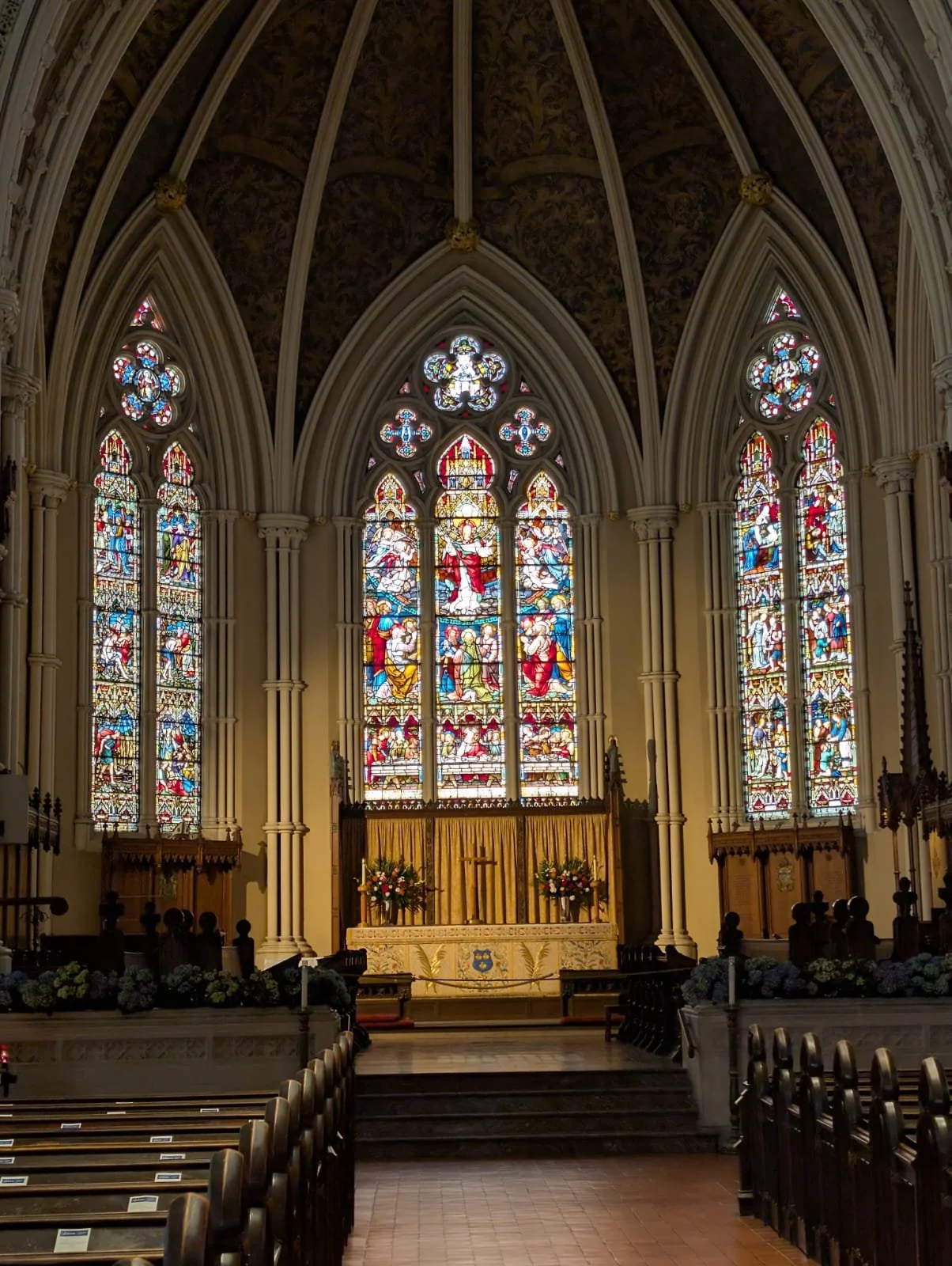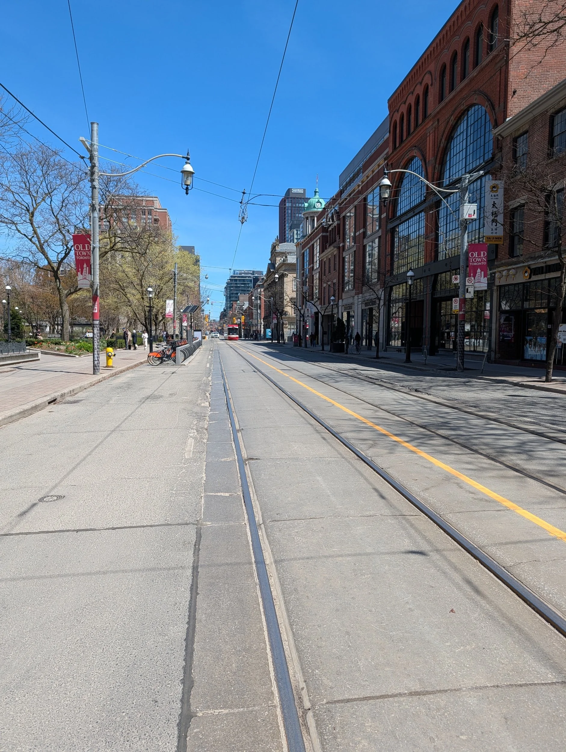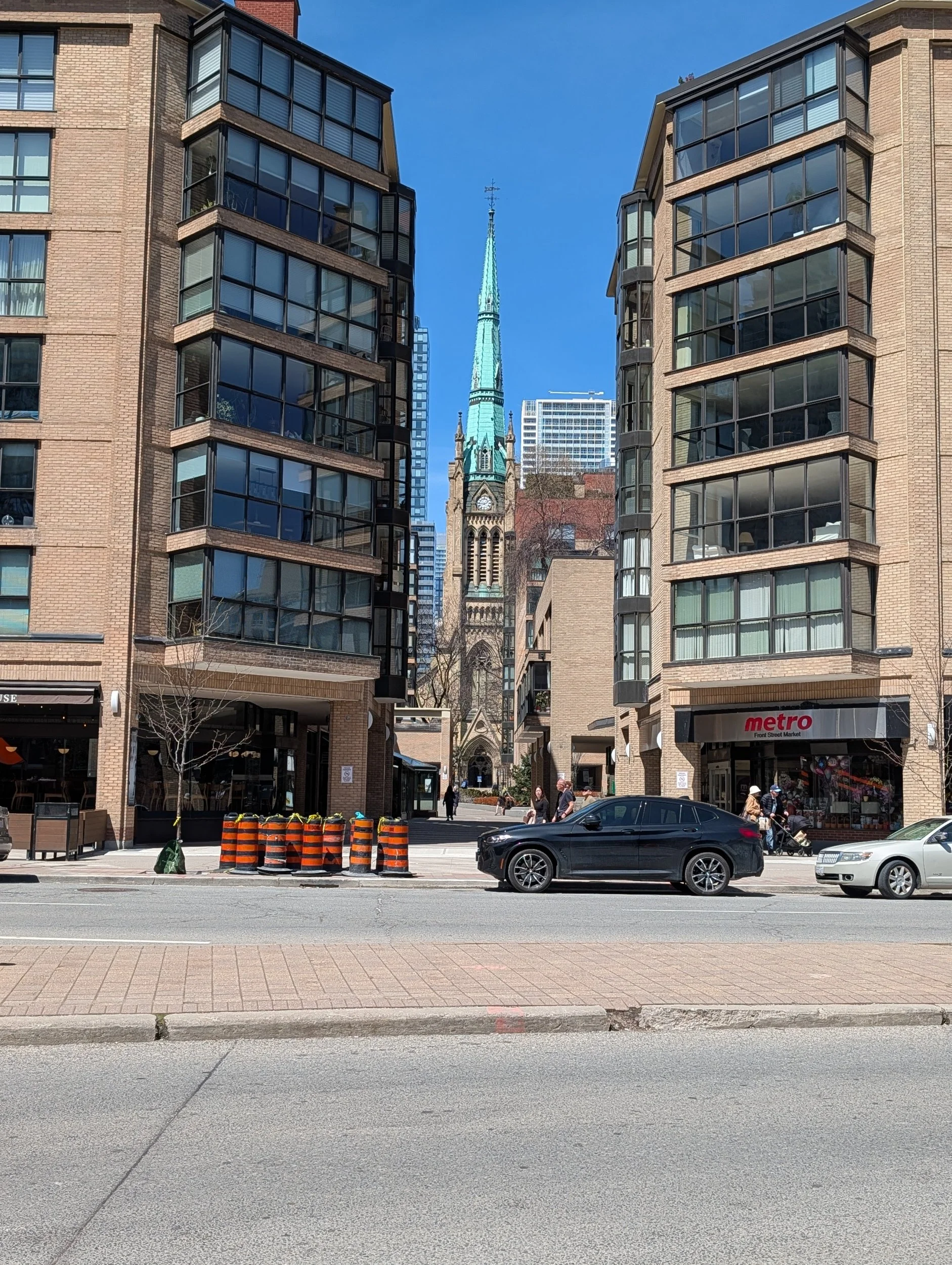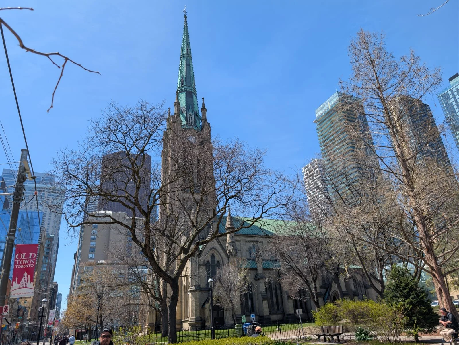We wandelen het station uit, moeten even goed kijken welke kant we op moeten. Maar lang leven Google maps we wandelen. En al wandelend lopen we door old Toronto lezen we op vlaggen aan de gebouwen. Wat leuk al die lage oude gebouwen. Aan ons linkerhand zien we door de straten heen een grote kathedraal staan. Het blijkt de St. Josephs cathedral te zijn. We besluiten even naar binnen te lopen. Het is een kathedraal met mooie glas in lood ramen en een groot orgel. Na een rondje door de kerk gaan we weer naar buiten en wandelen verder. Wat is de sfeer hier anders zeg tussen alle oude gebouwen ipv tussen de moderne hoogbouw. Zoo leuk om te merken hoe groot de verschillen zijn in 1 stad. We wandelen langs een brandweerkazerne en hebben de mazzel dat er een uitruk is, dus de brandweerauto gaat er met veel kabaal vandoor. Hierna is het nog een minuut of vijf lopen en komen we bij ons doel.