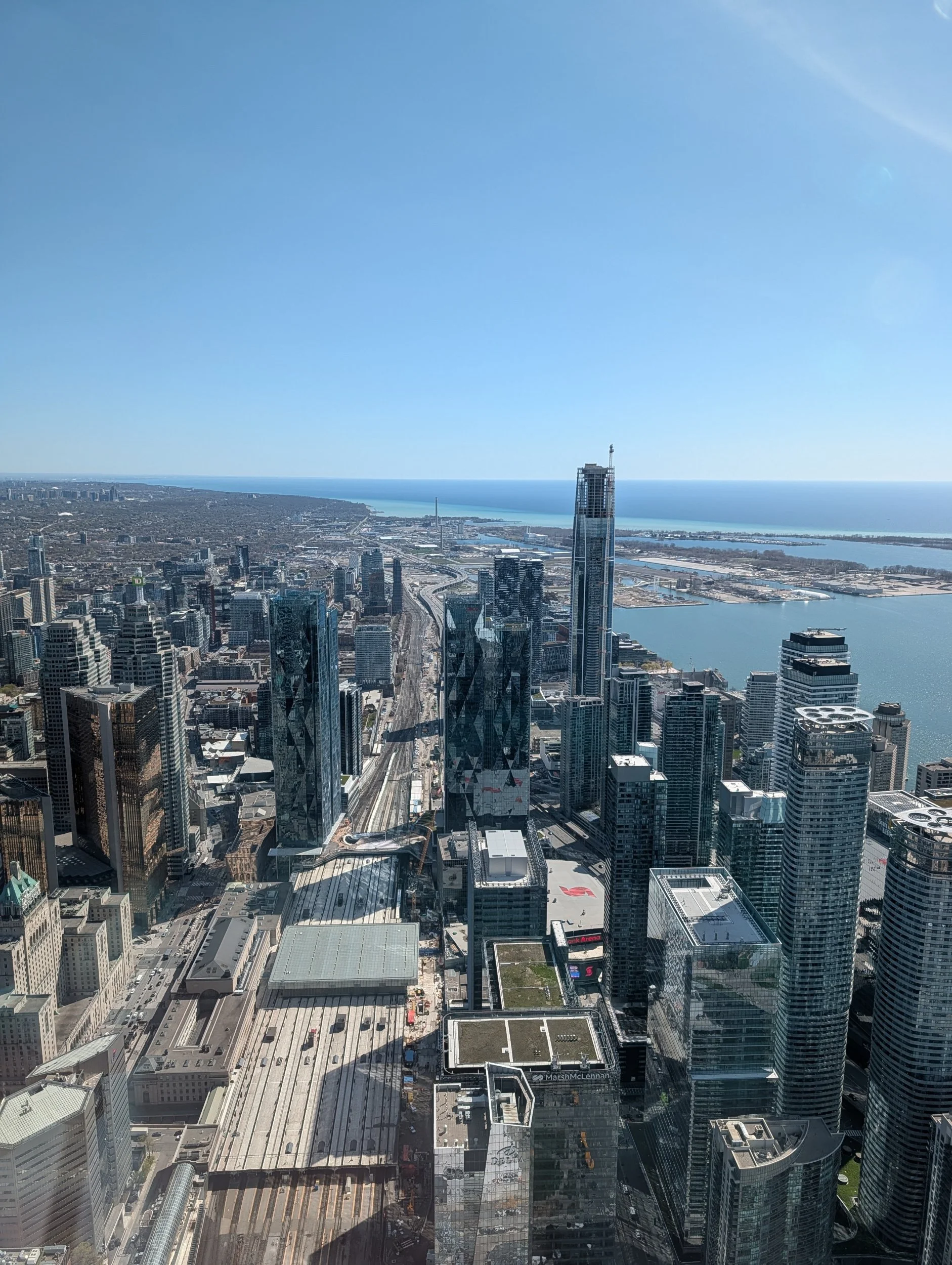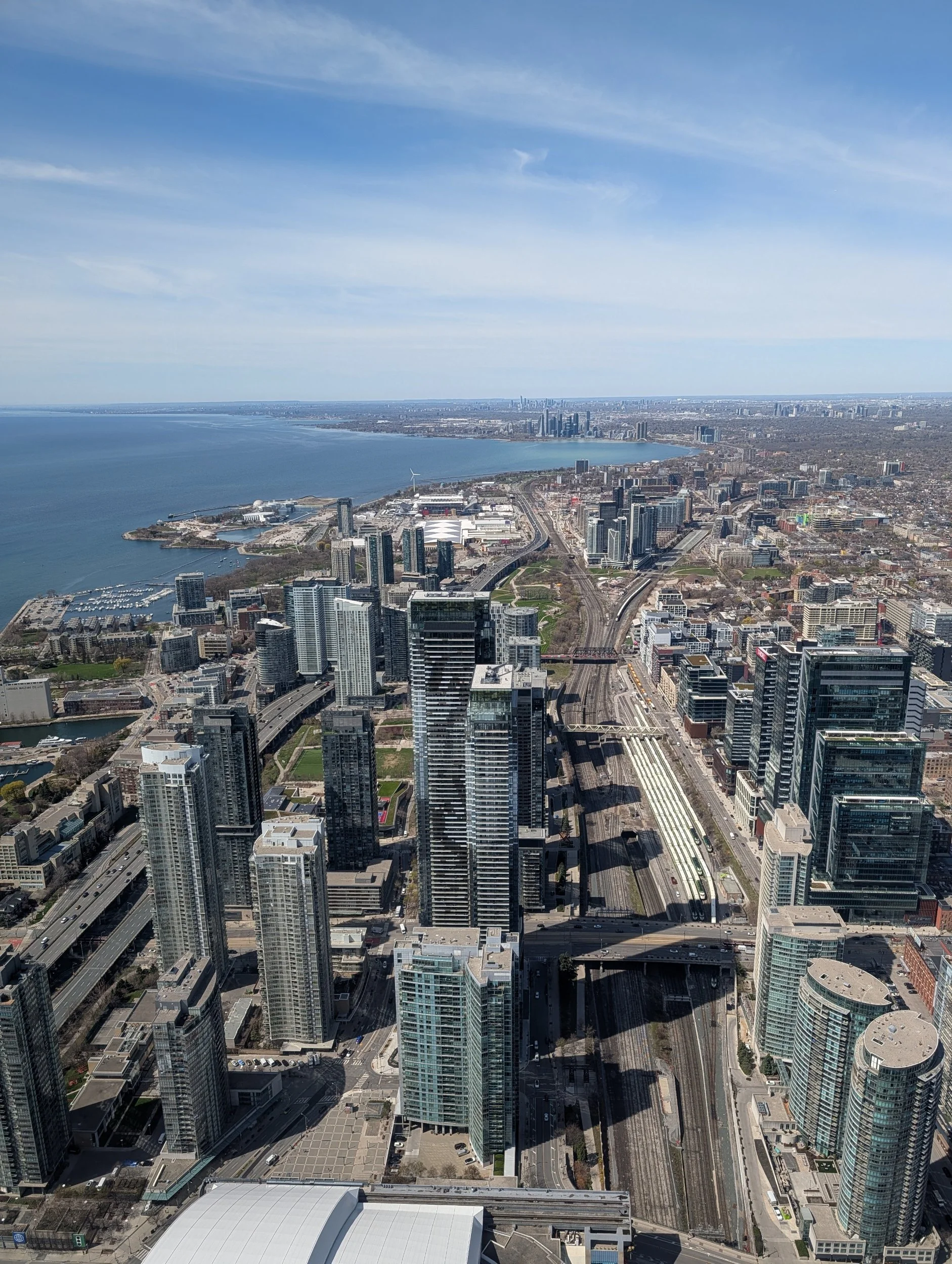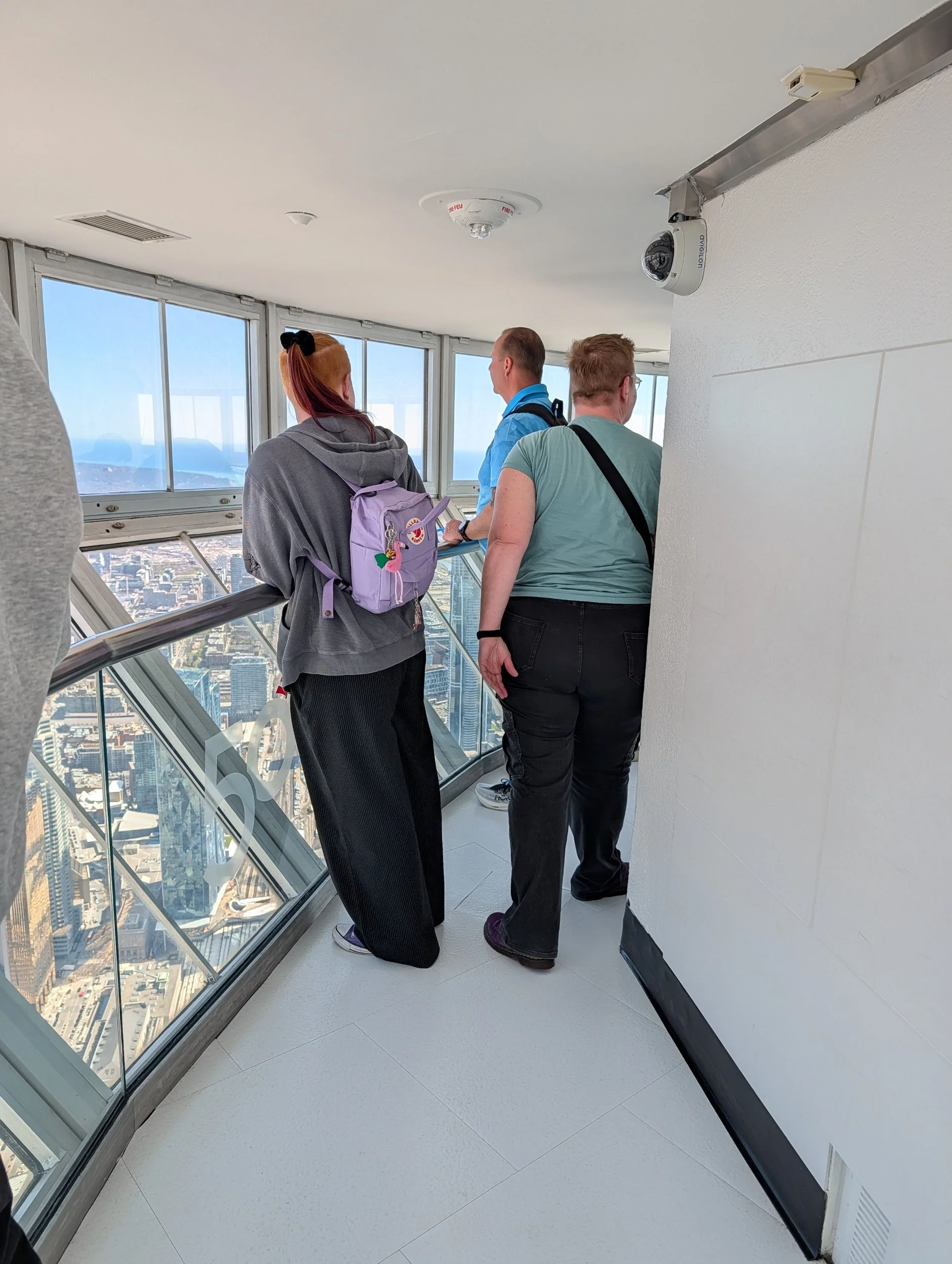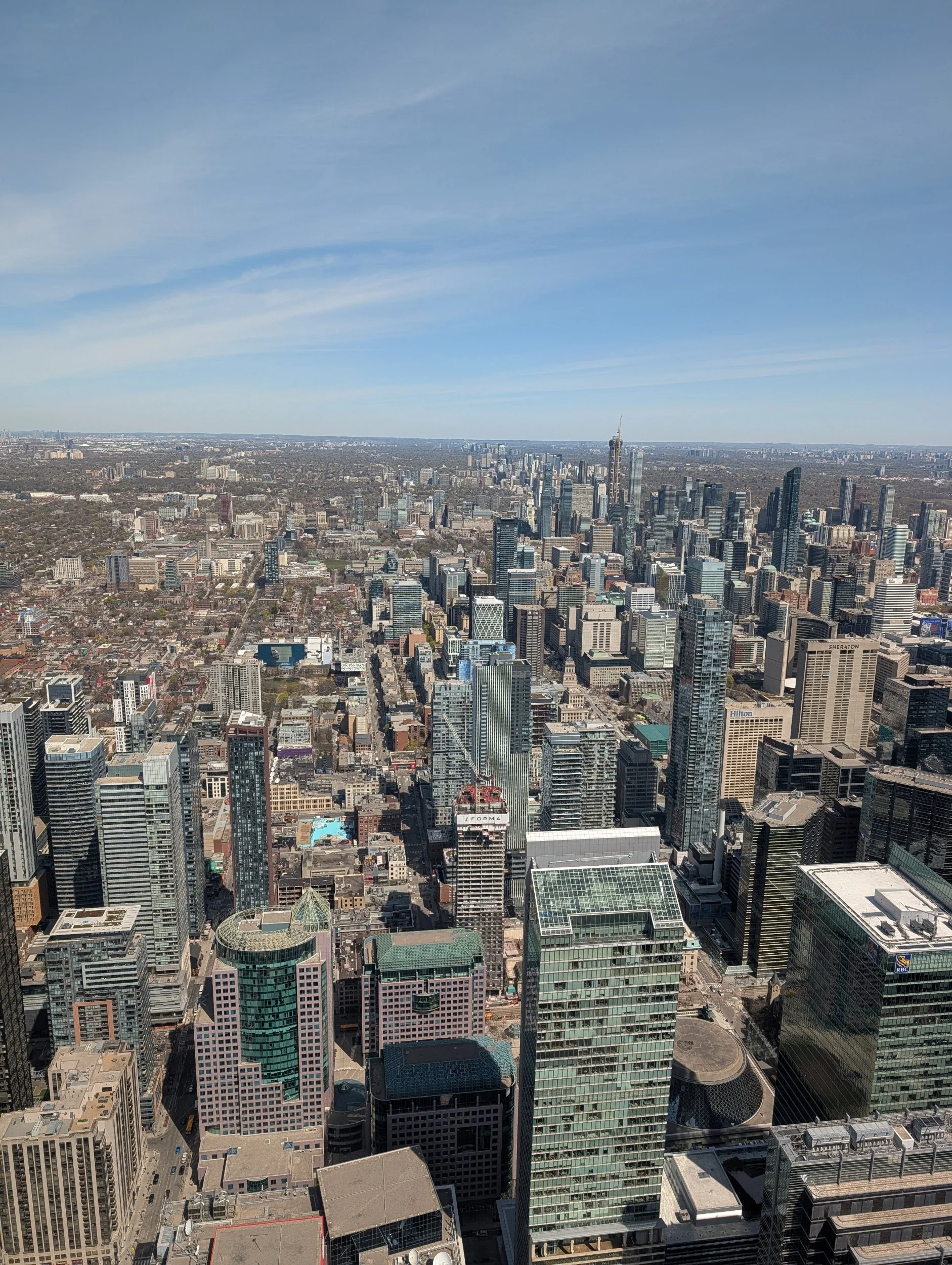 Als we Union Station uitstappen en de straat op lopen is het even zoeken in deze grote stad. Gelukkig zien we vrij snel de CN tower liggen (moeilijk te missen met zijn 553 meter) en besluiten we Google maps die richting op in te stellen. De route bevat een fikse klim 4 trappen op naar boven en uiteindelijk blijkt dat we vanaf Union Station gewoon binnendoor hadden kunnen lopen… maar goed geeft niet… Eenmaal voor de deur blijkt het rustig te zijn, beter gezegd we hoeven niet eens een tijdslot te boeken. Nee hoor we kunnen gewoon direct na de security check kaartjes regelen en zonder wachtrij naar boven. De lift gaat razendsnel omhoog en het uitzicht wordt hoe langer hoe mooier! Al snel stappen we uit op 346 meter en wauw!!! Toronto ligt aan onze voeten!