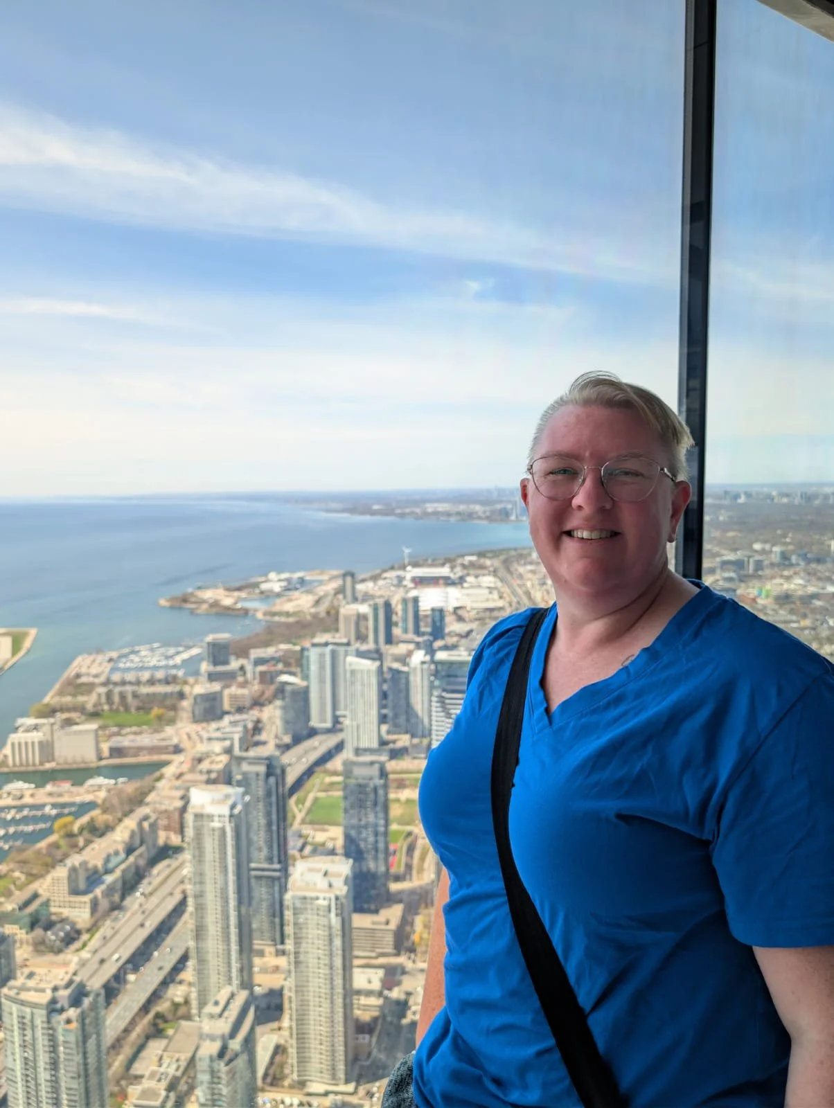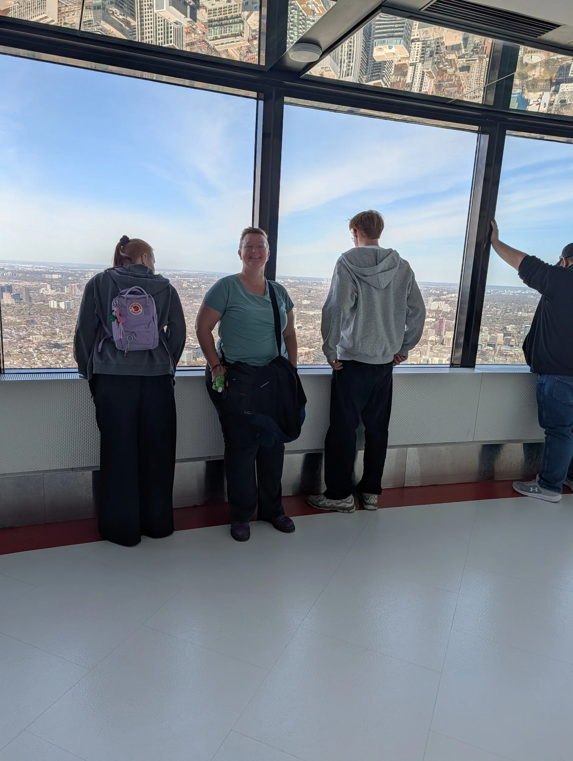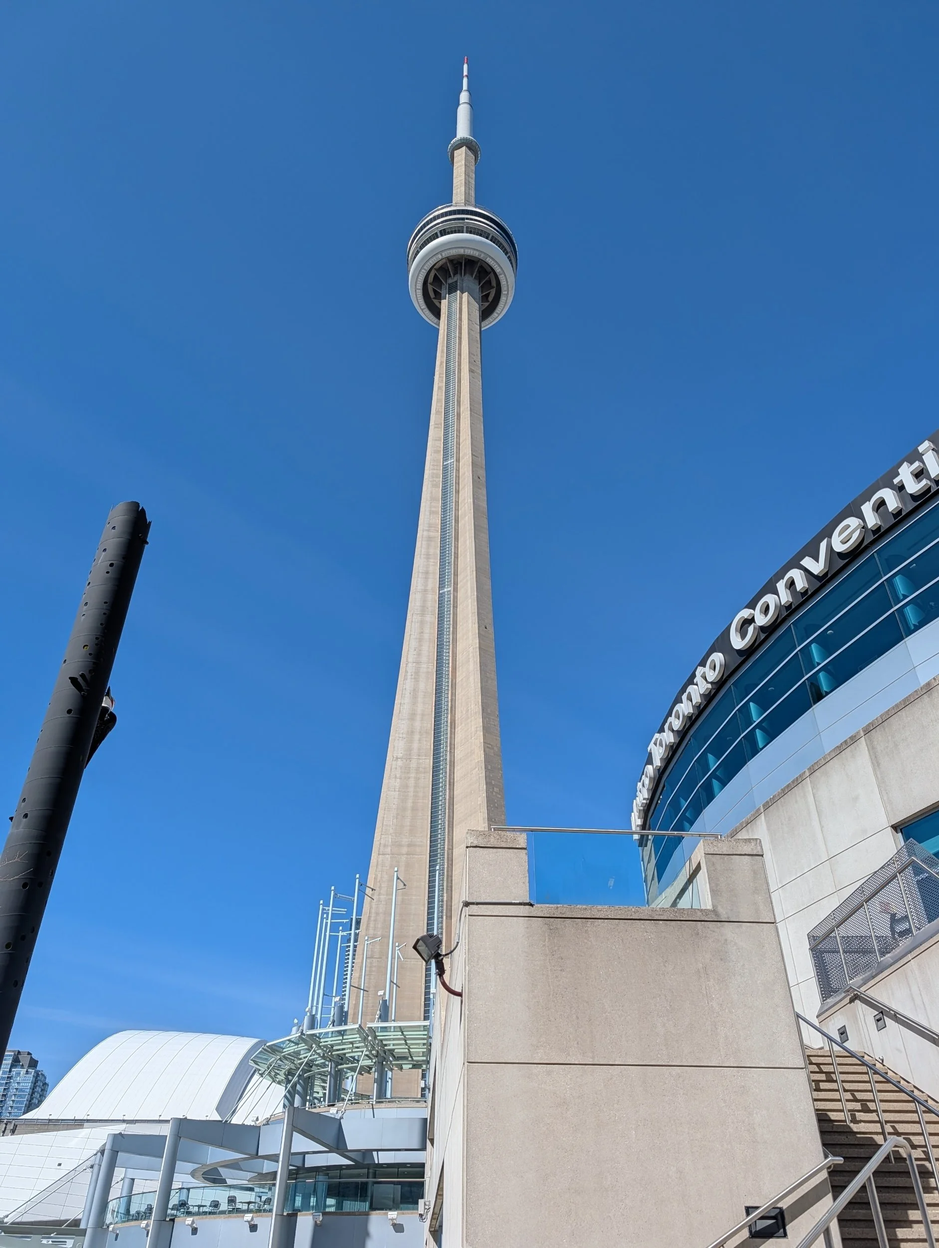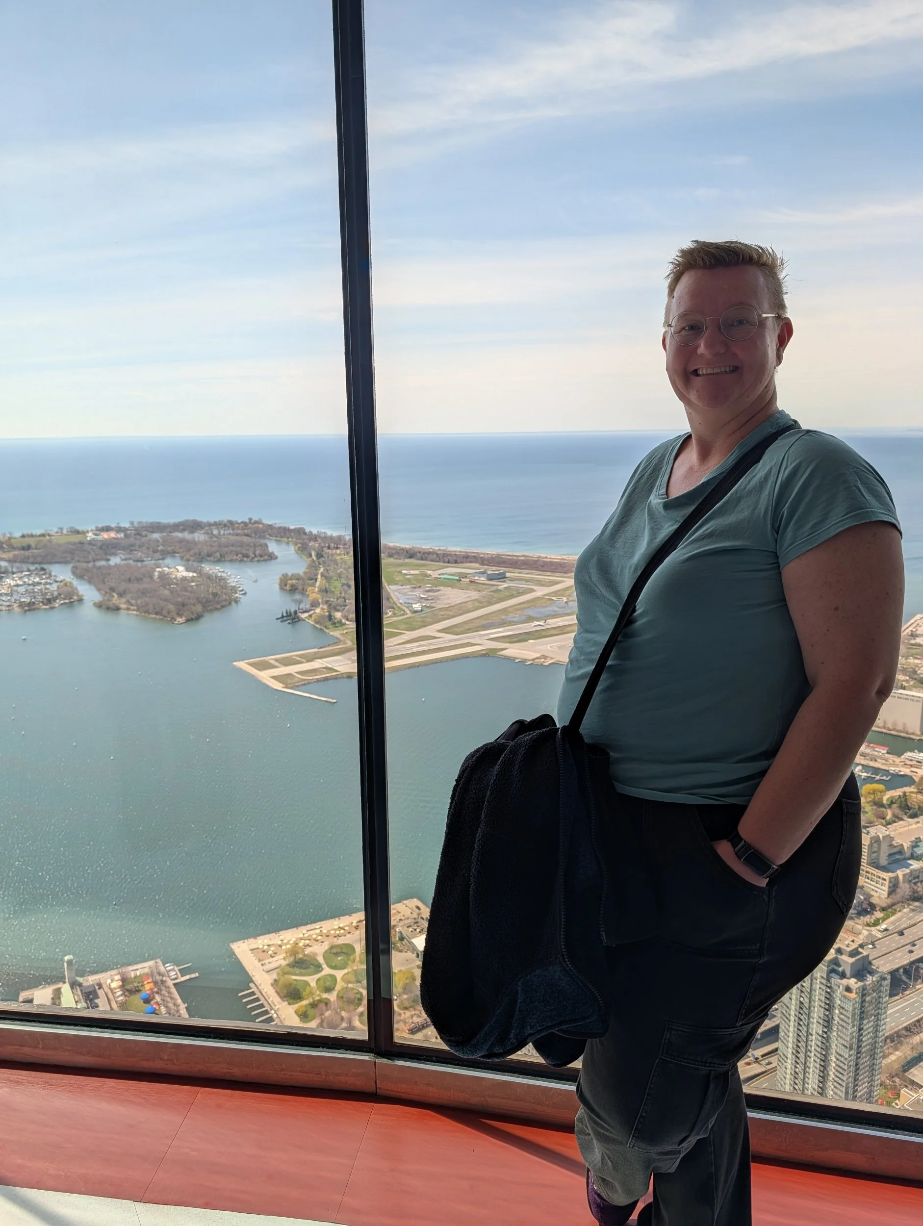 Als we Union Station uitstappen en de straat op lopen is het even zoeken in deze grote stad. Gelukkig zien we vrij snel de CN tower liggen (moeilijk te missen met zijn 553 meter) en besluiten we Google maps die richting op in te stellen. De route bevat een fikse klim 4 trappen op naar boven en uiteindelijk blijkt dat we vanaf Union Station gewoon binnendoor hadden kunnen lopen… maar goed geeft niet… Eenmaal voor de deur blijkt het rustig te zijn, beter gezegd we hoeven niet eens een tijdslot te boeken. Nee hoor we kunnen gewoon direct na de security check kaartjes regelen en zonder wachtrij naar boven. De lift gaat razendsnel omhoog en het uitzicht wordt hoe langer hoe mooier! Al snel stappen we uit op 346 meter en wauw!!! Toronto ligt aan onze voeten!