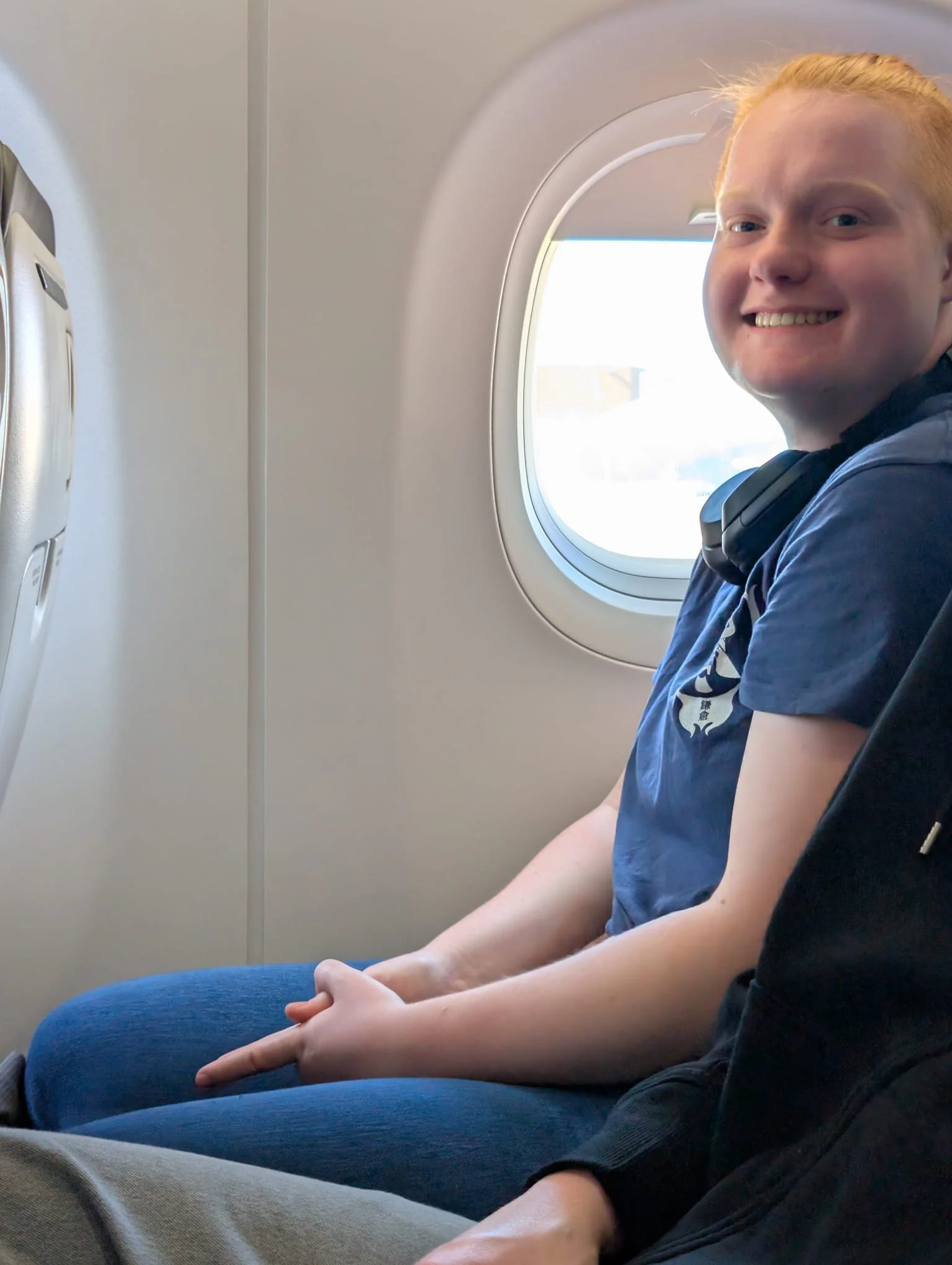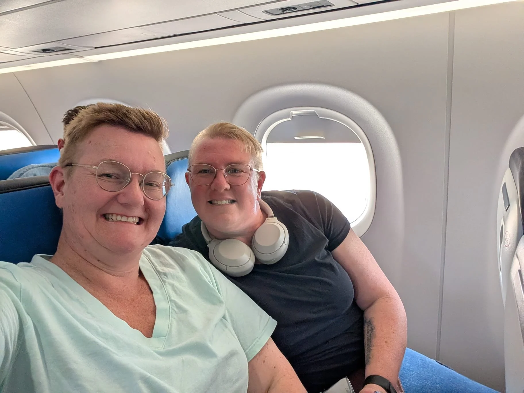 We volgen braaf de bordjes en staan dan in de rij voor de bus van terminal 4 naar terminal 3. Hij vertrekt over 8 minuten dus helemaal goed. Als het bijna tijd is doet de chauffeur de deur open en mogen we de bus in. We worden wel geacht te gaan zitten, aldus de begeleidende meneer, dat doen we dan maar. De bus rijdt een flink stuk over de luchthaven en kiepert er ons netjes bij terminal 3 uit. Hier moeten we wederom door een security check. Maar tot ons genoegen mag ook hier alles in de tas blijven zitten. Helaas, wordt de tas van yours truly Le er tussenuit geschoven en moet hij open. De security meneer pakt de hoes van onze camera eruit. Met daarbij de opmerking dat hij hem kent, maar zijn collega’s blijkbaar nog niet. Hij bekijkt hem even, doet een standaard verboden middel swapje en dan mogen we door. Hij geeft ons met grote lol nog de “tip” om de camera buiten op het vliegtuig te plaatsen en zo briljante videocontent te maken hahaha. Wij keuren deze optie met een big smile meer dan goed! Het boarden is al gestart als we bij de gate aankomen, maar er moet echt nog even een sanitaire stop gemaakt worden voor we aansluiten. Gelukkig past dit makkelijk en zijn we netjes optijd voor het tweede deel van onze reis. Hopelijk waren onze tassen dat ook…